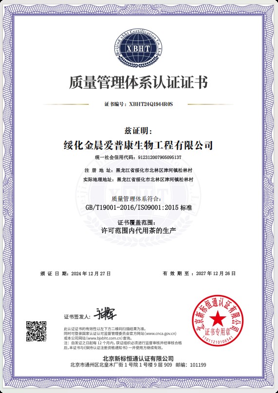 綏化金晨愛普康生物工程有限公司位于黑龍江省中南部地區(qū)的綏化市北林區(qū),所處位置東經(jīng)124度,北緯45度,位于松嫩平原的呼蘭河流域,“有寒地黑土,塞北江南”的美譽,是全國重要的商品糧基地,屬中溫帶大陸性季風(fēng)氣候,四季分明,雨熱同期,冬季冰雪覆蓋,夏季降雨集中氣候溫?zé)釢駶櫋=椈鸪繍燮湛瞪锕こ逃邢薰臼且患覍I(yè)從事健康養(yǎng)生產(chǎn)品研發(fā)、生產(chǎn)及銷售企業(yè),公司占地總面積8000平方米,建筑面積5000平方米,公司周圍無任何污染源,是食品生產(chǎn)基地。公司生產(chǎn)車間潔凈度級別達到10萬級,同時擁有數(shù)十臺先進的生產(chǎn)設(shè)備及高科技檢驗儀器,從產(chǎn)品的原輔料、中間品、成品到銷售的全過程嚴格把關(guān),使生產(chǎn)中每道工序都符合產(chǎn)品的高標(biāo)準(zhǔn)要求,從而保證了公司生產(chǎn)的每一袋產(chǎn)品合格,無質(zhì)量缺陷。綏化金晨愛普康生物工程有限公司率先采用了企業(yè)資源ERP管理系統(tǒng),肩負著養(yǎng)生產(chǎn)業(yè)的重要課題,同時又是江蘇省國家藥用植物重點實驗中心科研成果轉(zhuǎn)化的生產(chǎn)試驗基地,公司核心成員均為本科以上學(xué)歷。生產(chǎn)的產(chǎn)品有近五十個品種的代用茶產(chǎn)品,公司先后通過HALAL國際認證,編號為SSPY-201318-33849;ISO9001質(zhì)量管理體系認證編號為XBH···